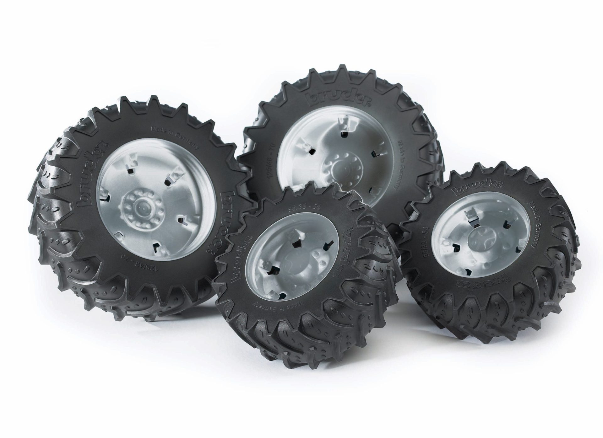 Sizes: rear tires 12.5 cm diameter, front wheels 9.8 cm diameter