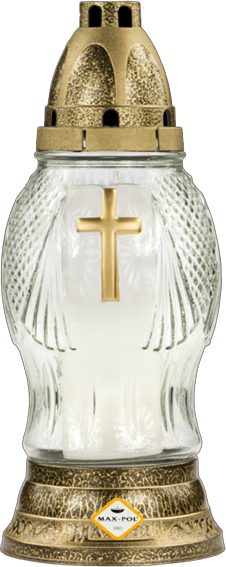 Max-Pol leiðislukt úr gleri með gylltum krossi. Kerti fylgir.