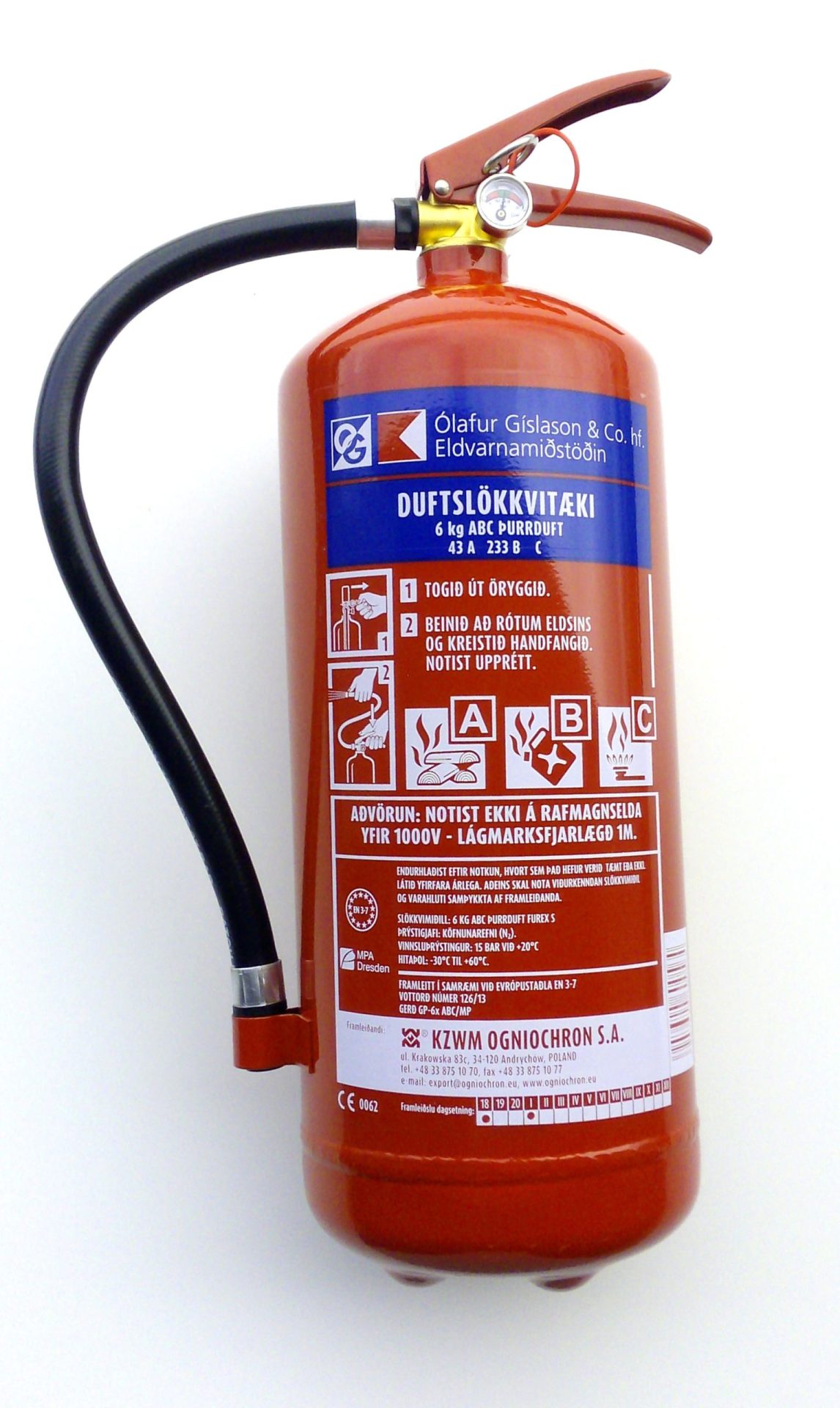 6 kg. Ogniochron Duftslökkvitæki m/mæli og veggfestingu.